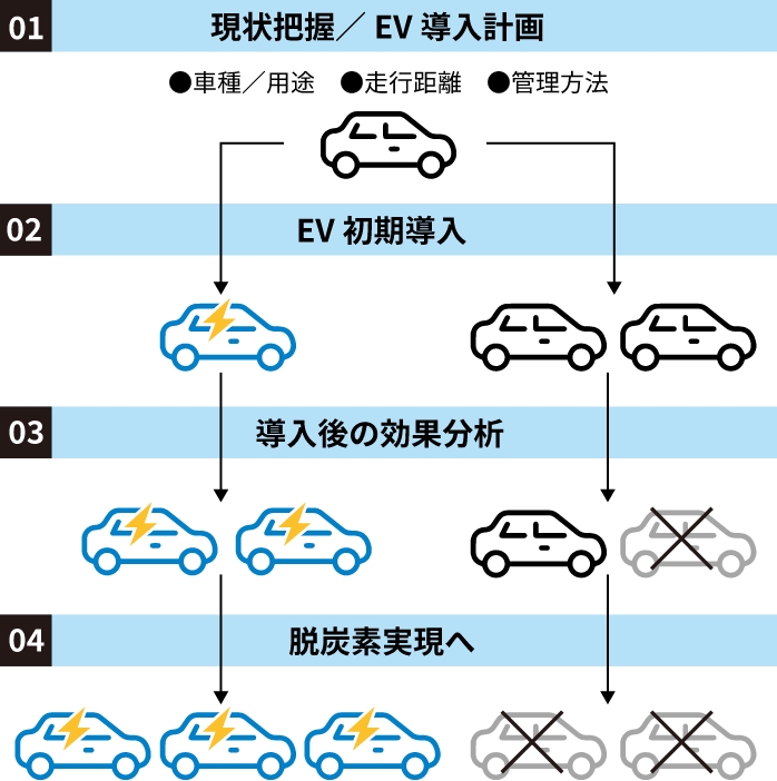 | 充電データの活用 | EV導入シミュレーションや 車両削減支援と連携 |