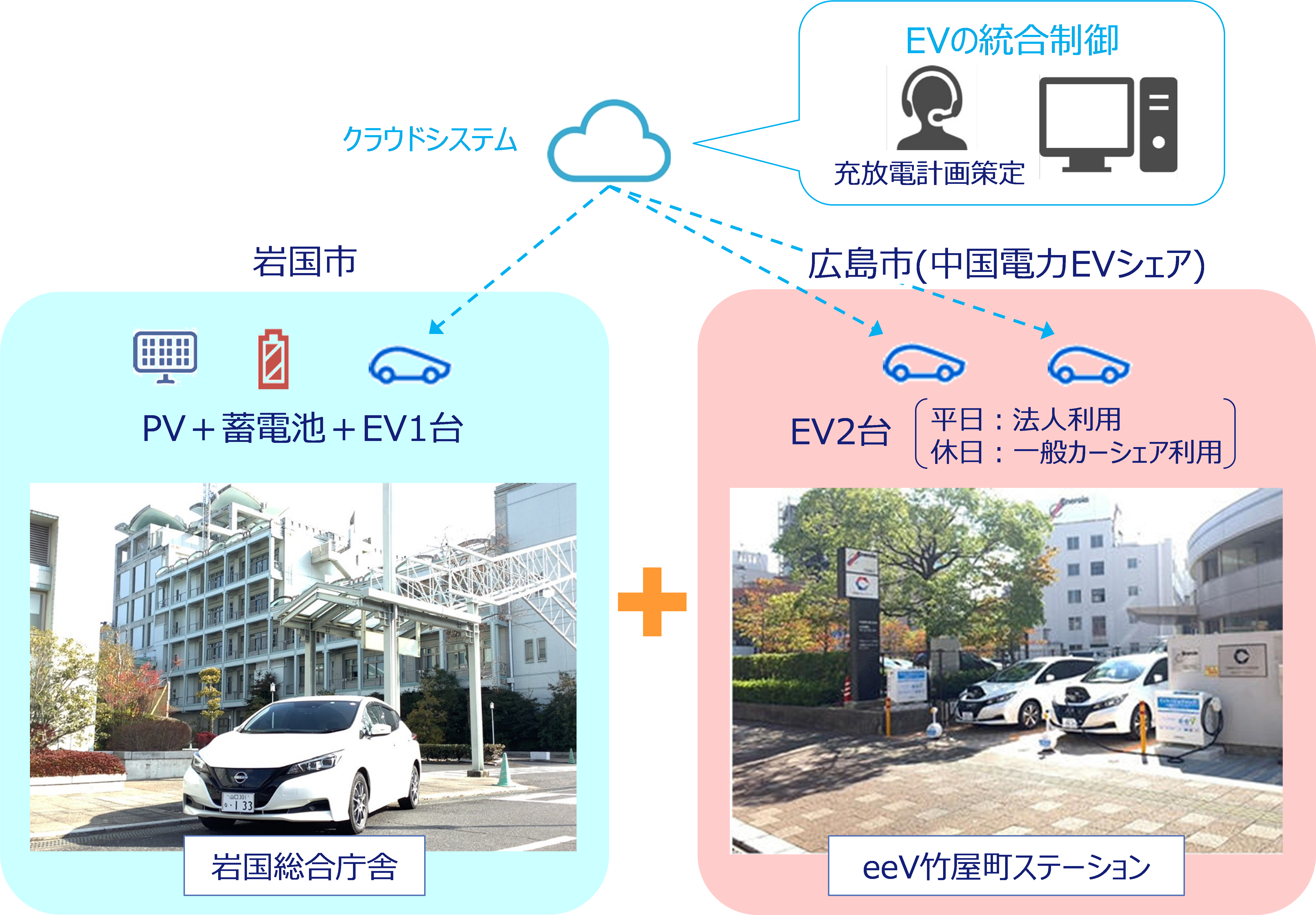 岩国市と広島市の2地点において、計3台のEV(山口県所有1台、中国電力がeeV(イーブイ)※2で使用する2台)をREXEVのEV管理および制御の仕組みと東芝エネルギーシステムズのVPPクラウドシステムにより遠隔制御することで、エネルギーマネジメントへの活用可能性について検証します。