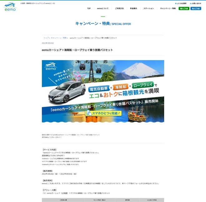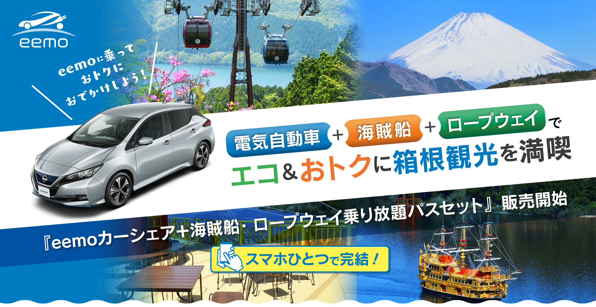 株式会社REXEV(本社:東京都千代田区、社長:渡部 健)、箱根観光船株式会社(本社:神奈川県小田原市、社長:岡本 裕之)、箱根ロープウェイ株式会社(本社:神奈川県小田原市、社長:飯田 直保志)と小田急電鉄株式会社(本社:東京都新宿区、社長:星野 晃司)は、2022年3月18日(金)から9月30日(金)まで、電気自動車カーシェアリング「eemo(イーモ)」のキャンペーンサイトとアプリ「eemo」にて、共同企画商品「eemoカーシェア+デジタル海賊船・ロープウェイ乗り放題パスセット」を販売します。