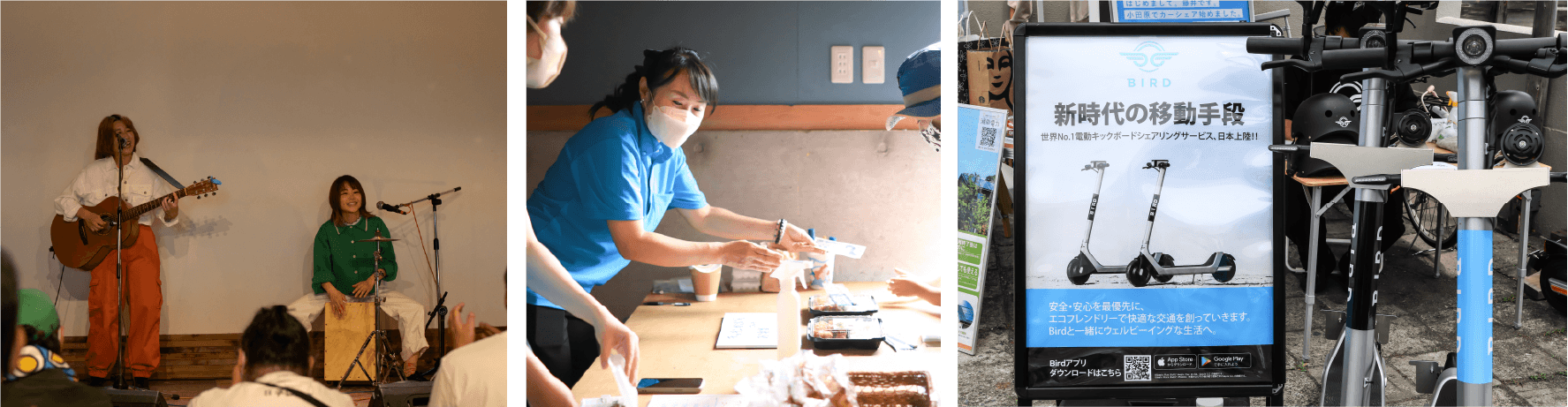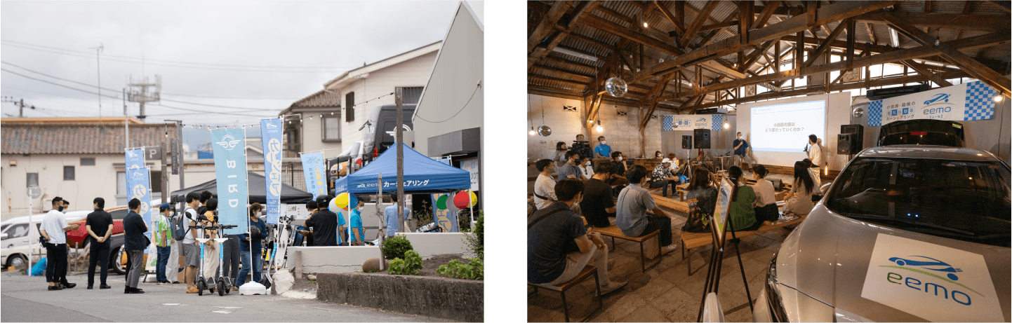 ステージではトークセッションのほかにも藤沢発青春ロックバンド「チロル」のアコースティックライブが行われました。会場内では小田原の地元企業のフードやドリンクが販売され、外ではEV試乗会、電動キックボード「BIRD」試乗会も賑わいを見せていました。