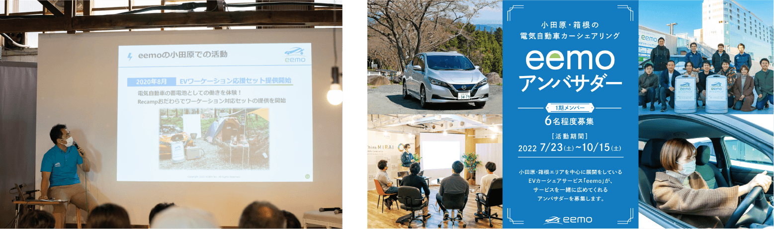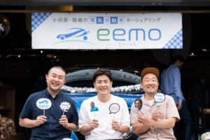 株式会社REXEV(本社:東京都千代田区、社長:渡部 健)が運営する電気自動車(以下「EV」)カーシェアサービスのeemo(イーモ)は、2022年6月でサービス開始から2年を迎えました。2022年6月11日(土)に、2周年記念イベント「Odawara Energy Day 2022 ~eemo 2nd Anniversary~」を開催し、eemoの事業報告、小田原市長をはじめ、小田原に移住された方、小田原でワーケーションを推進する方など各方面で活躍する方々をお招きしたトークセッションを行いました。