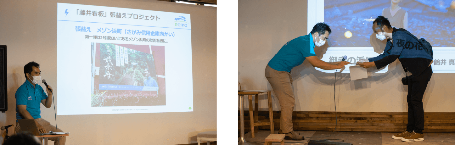 2周年を記念して開催された「藤井看板張替えプロジェクト」の説明と「笑顔あふれるおだわらの暮らしフォトコンテント」の表彰式が行われました。