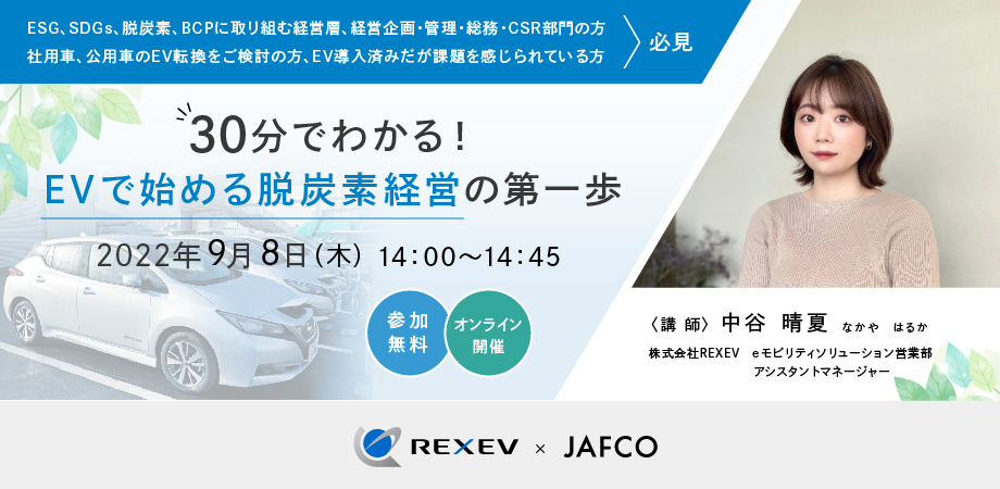 近年、急速に取り組みが広まる脱炭素化社会を背景に、再生可能エネルギーやEVの普及が進んでいくことが予想されます。そういった背景から企業にも脱炭素経営が求められていく中で、「そもそも何から始めたらいいのかわからない」「まずは取り組みやすいところから着手していきたい」というニーズを抱える経営者さまやご担当者様もいらっしゃると思います。電気で走る環境にやさしいEVは、車載バッテリーを搭載しているという特性により社用車として導入することでCO2の削減はもちろんのこと、災害時には「走る」非常用電源としてBCP対策にも活用いただけます。 EVの車両および充電管理システムを提供するREXEVより、最新動向を踏まえて社用車のEV化によって始める脱炭素経営をわかりやすくご説明いたします。