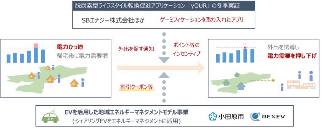 このたび、小田原市と株式会社REXEVは、このEVモデル事業とSBエナジー株式会社他が実施する脱炭素型ライフスタイル転換促進ウェブアプリケーションを活用した、外出の促進等につながるゲーム体験の提供とポイント等のインセンティブの付与による人の行動変容によるディマンドリスポンス実証事業の冬季実証※1に参加します。
