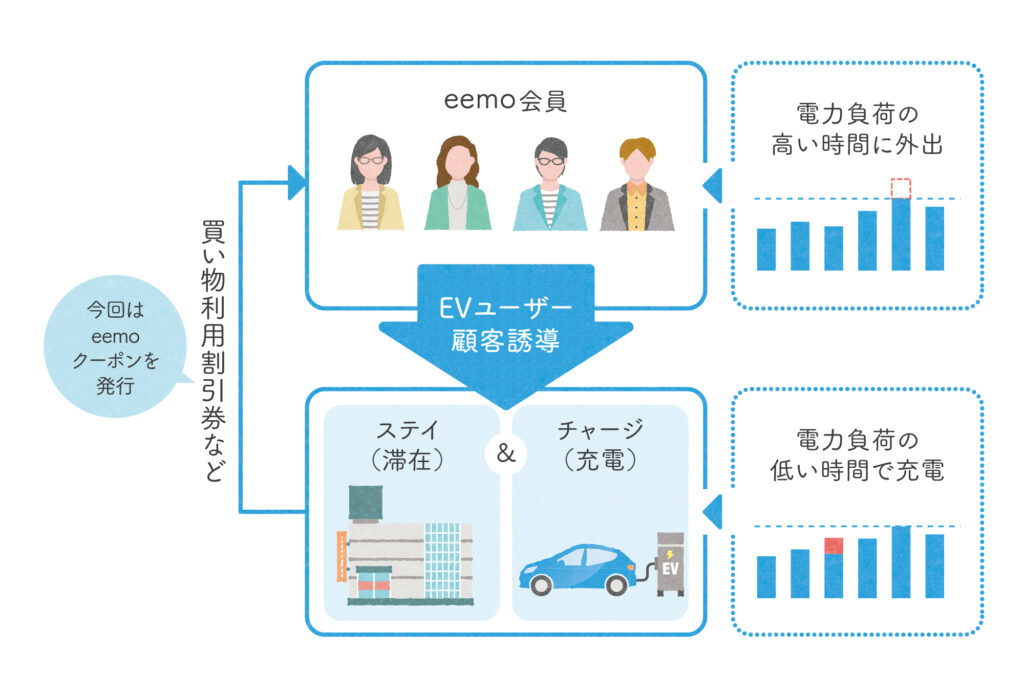 「yOUR」の外出キャンペーン実施通知で指定される対象時間帯に、eemo会員に対し、充電器がある提携ステイスポット(道の駅、ショッピングモール、温浴施設等)で、お得にステイ&チャージし、電力負荷の低い時間帯での充電と店舗や観光スポットへ顧客誘導を促します。