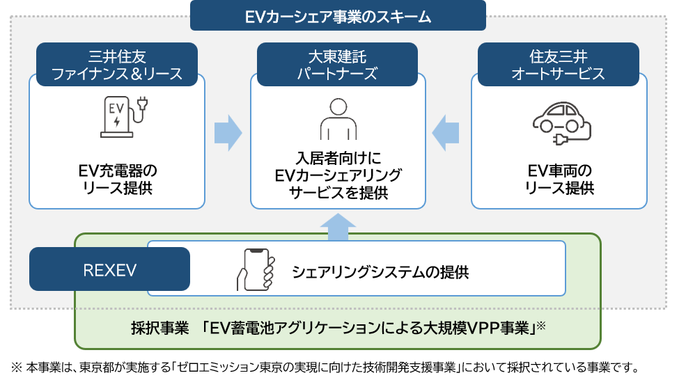 株式会社REXEV(本社:東京都千代田区、代表取締役社長:渡部健、以下、REXEV)は、2023年3月より、大東建託グループの大東建託パートナーズ株式会社(本社:東京都港区、代表取締役社長:佐藤功次、以下、大東建託パートナーズ)、三井住友ファイナンス&リース株式会社(本社:東京都千代田区、代表取締役社長:橘正喜、以下、三井住友ファイナンス&リース)、住友三井オートサービス株式会社(本社:東京都新宿区、代表取締役社長:佐藤計、以下、住友三井オートサービス)と共同で、大東建託パートナーズが管理する賃貸住宅の入居者を対象に、同社の社有車を活用した「電気自動車(以下、EV)カーシェア」の事業化に向けた取り組みを開始します。