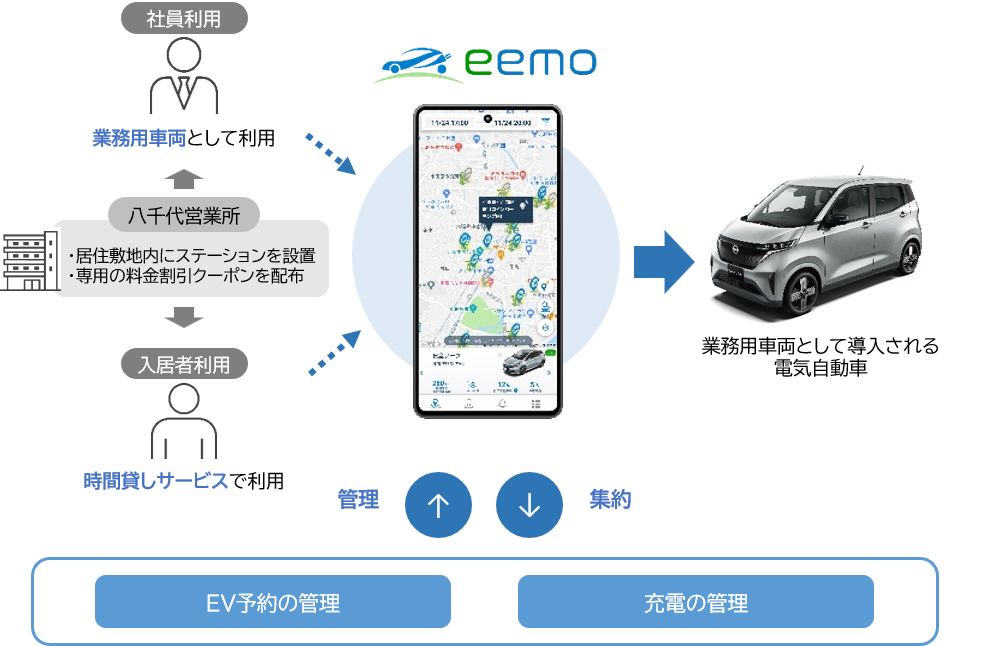この取り組みは、大東建託パートナーズの八千代営業所(千葉県八千代市)によって新たに導入される、業務用EVの未利用時間を活かす新たな活用策として、同社が管理する賃貸住宅に住む入居者を対象に開始します。本サービスは、REXEVが提供するEV特化型のカーシェアサービス「eemo(イーモ)」アプリで予約することによって利用が可能です。また、入居者向けには、大東建託パートナーズの運営する、暮らしに役立つサービスプラットフォーム「ruum(ルーム)」から本サービスの利用促進に向けた案内を行い、入居者のさらなる暮らしの利便性向上をはかります。