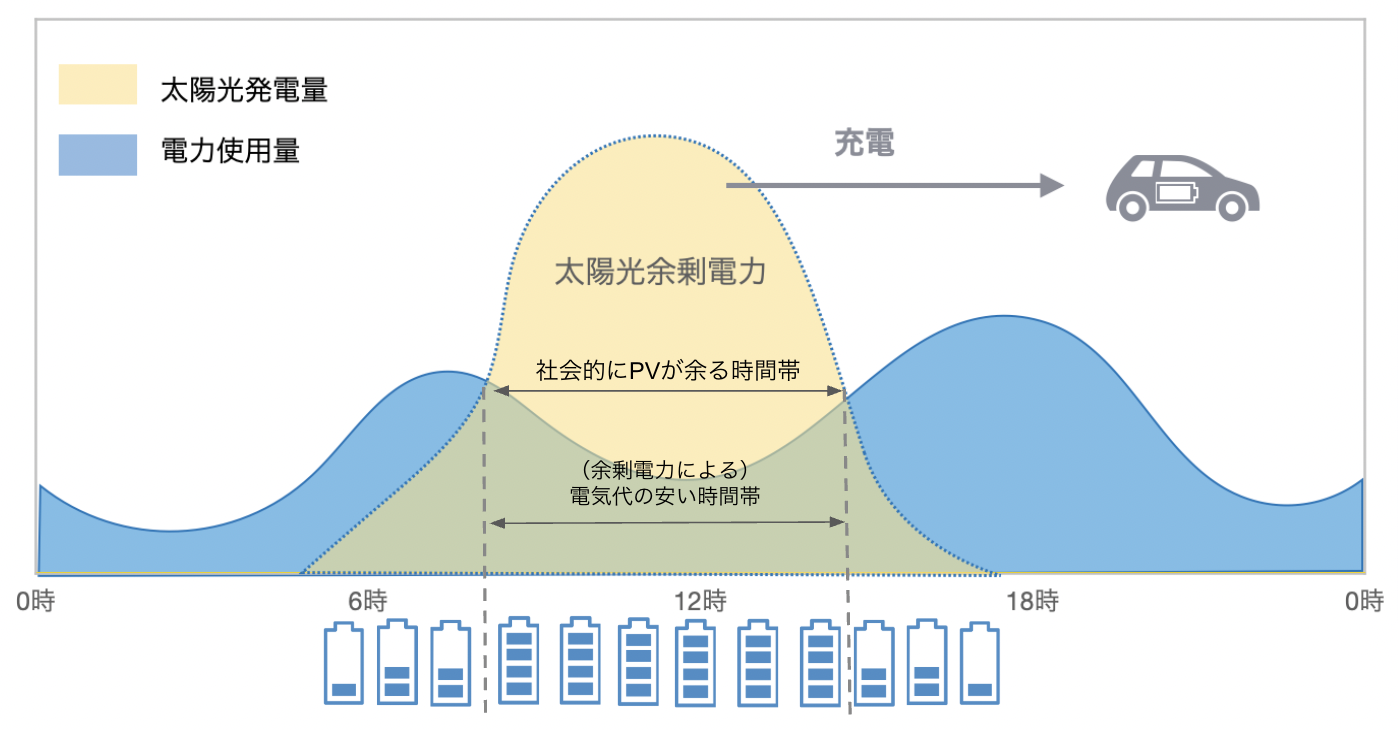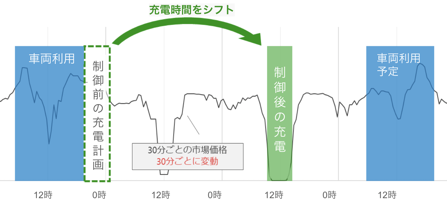 電力の市場価格やEV車両の利用状況に応じて経済的に充電します。また可能な限り昼間の太陽光発電電力が余る時間帯に充電を実施することにより、余剰電力調整にも貢献します(図 1 参照)。