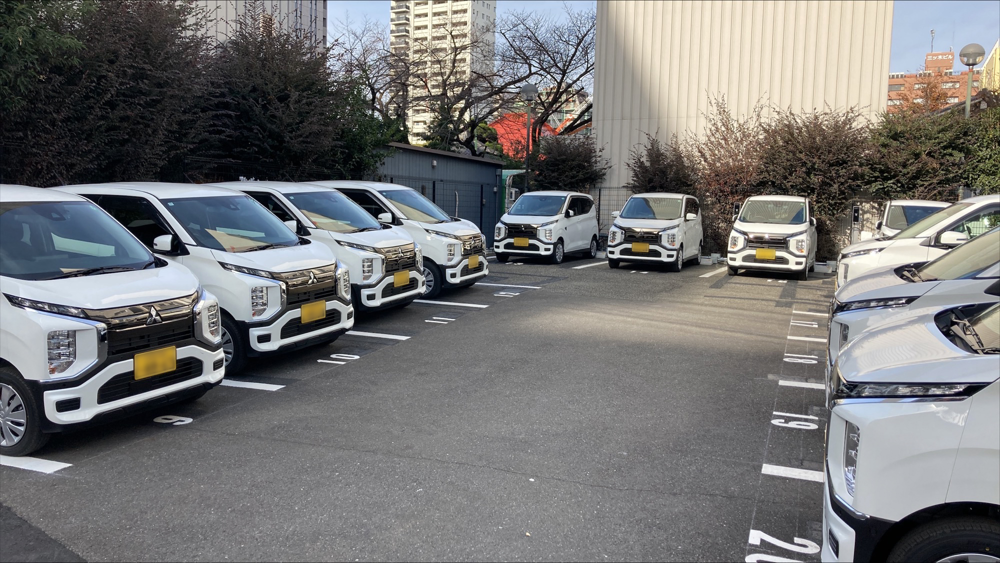 事業活動に伴う GHG(温室効果ガス)の排出削減を目的として、三菱UFJ銀行の駐車場に充電器を設置し、近距離走行を目的とした営業車18台を順次EVへ切り替えます。