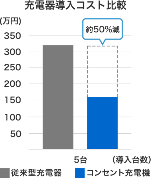 コンセントタイプの充電器は、本体価格が5,000円/台からと一般的な充電器(20万円〜/台)に比べて大幅に安価です。また、導入台数が多くなるほど、工事費用を抑えることができ、例えば充電器を5台導入する場合は、導入コストは従来比で約50%削減できます(※REXEV試算)。