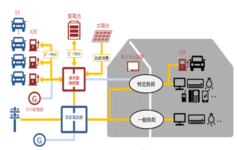 太陽光発電や蓄電池、EVを組み合わせることで、災害に対応できる電源確保と、平常時の設備有効活用との両立を目指す。