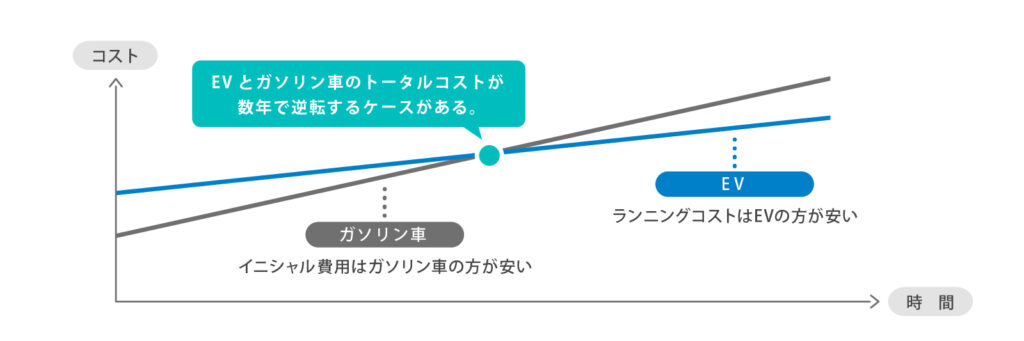 EV導入にあたり、導入費用はガソリン車よりも高くなりますが、燃料費や税金などの維持費は大きく抑えられます。これにより、利用形態によっては数年でトータルコストが逆転する車両もあります。現状車両の導入コストと利用状態から算出されるランニング費用を踏まえて、経済的合理性があるかどうかを判断しましょう。