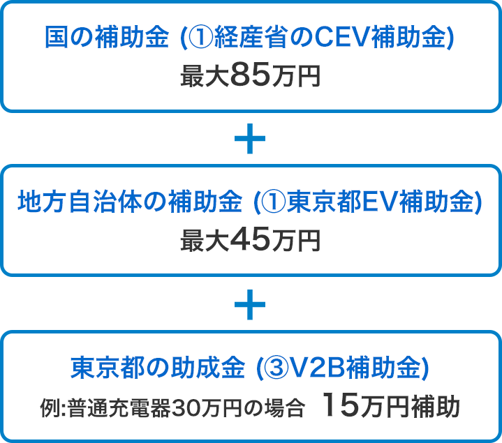 地方自治体の助成金は、国・地方自治体の一部補助金と併用が可能です。東京都の場合、ZEV補助金で補助の対象と認められたものに関して、助成金が認められます。