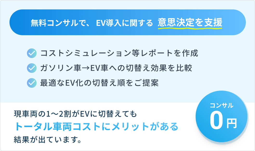 必要な台数やガソリン車との比率などの算出は無料シミュレーションに含まれておりますので、ぜひご利用ください。